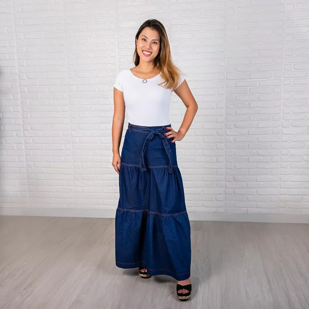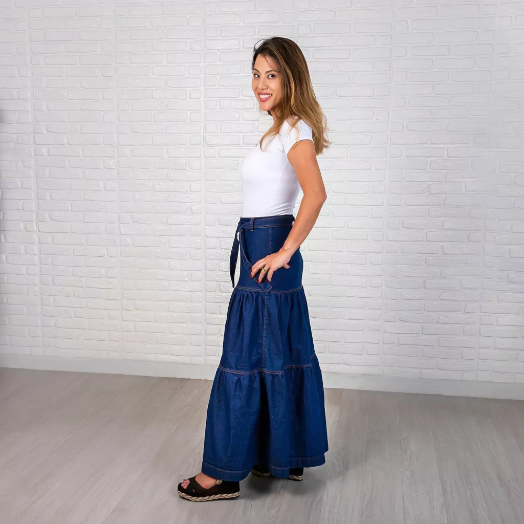 Eleve seu guarda-roupa com a Saia Longa Jeans Trijeito, onde cada detalhe reflete a combinação perfeita entre elegância e descontração. ✨👗