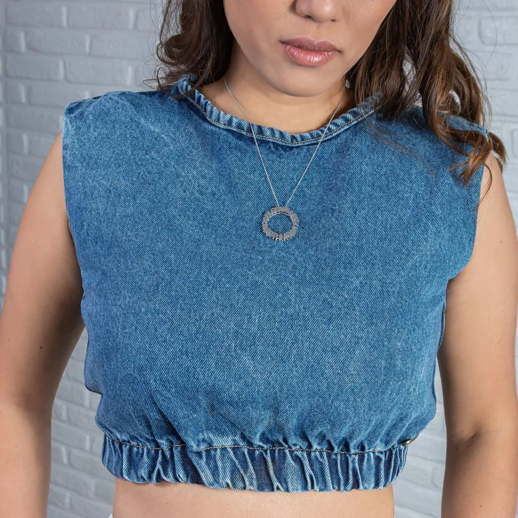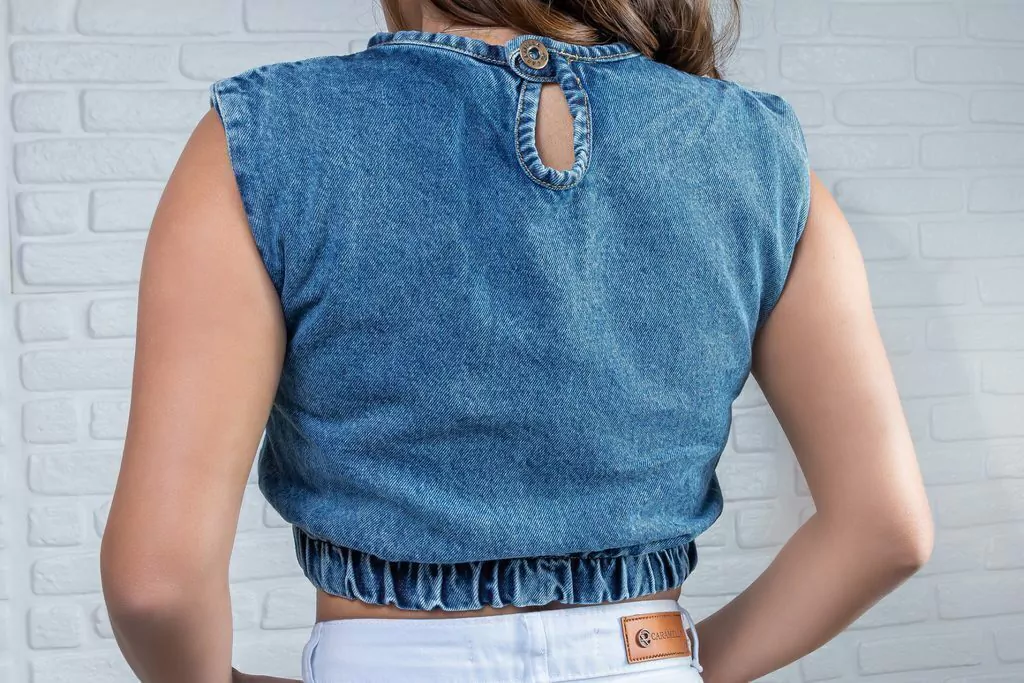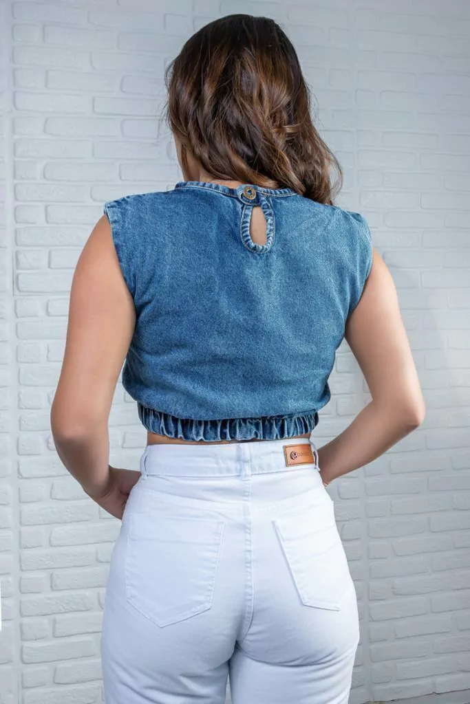 Cropped jeans de alcinha com botões frontais. Um item versátil e estiloso para compor looks modernos e despojados.